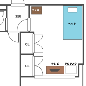 シングルベッドを置き、寝室にPCスペースを作ったレイアウト。 TVスペースも確保でき、寝室でも趣味を楽しめるプランです。 せっかくの居室を寝るだけでなく、趣味の部屋として活用してはいかがですか?