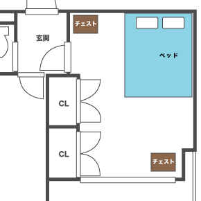 ゆったりとダブルベッドを置いたレイアウト。 せっかくの一人暮らし、優雅に大きなベッドで寝たい人向けのプランです。 寝室には雑音を入れず、ゆっくりと寝たい人はこちらがオススメです。