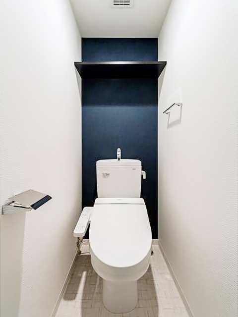 ウォシュレット付きで、上部にも棚付き。