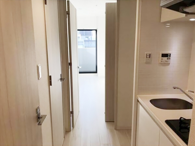 左側には水回りの扉が並んでおりキッチンもあります。