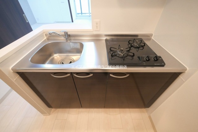2口コンロでシンクも広く収納もあります。