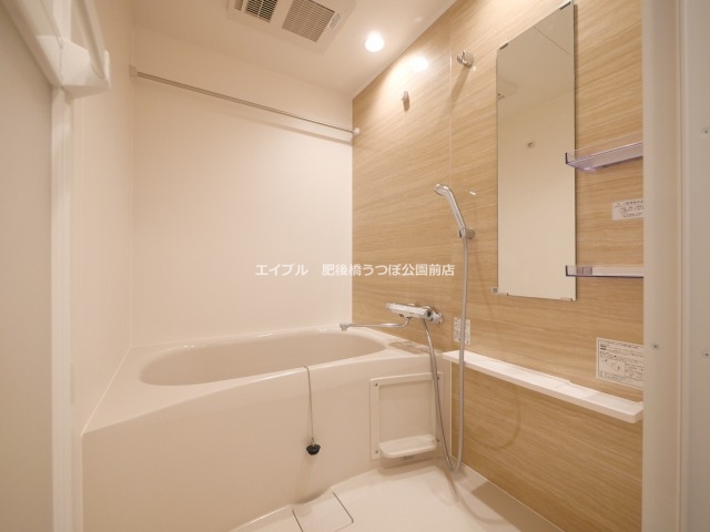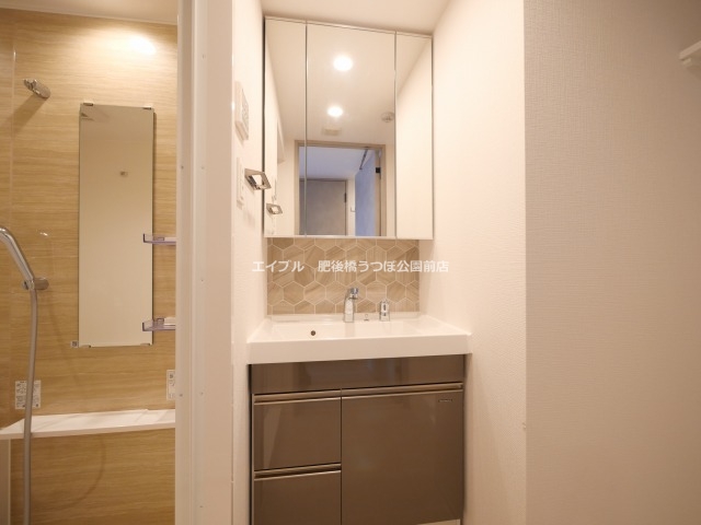 鏡下や横に棚があり、浴室乾燥も備わっています。