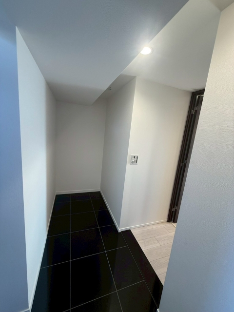 玄関を入るとブラックタイルの広い土間仕様になっていて