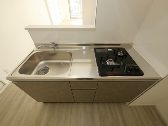 2口ガスコンロで、収納もしっかりとついていますし、洗い場、調理スペースも充分あるので快適に使っていただけます。