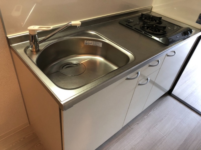 2口ガスコンロで収納も4つ付いていて食器もしっかりと収納していただけます。