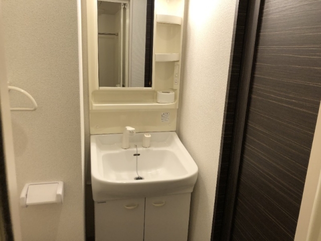 洗面台は化粧台となっていて、鏡横に棚と、下にも収納が備わっています。