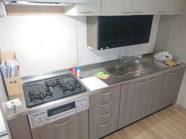 キッチンは3口ガスコンロで収納も沢山あり、グリルも付いています。