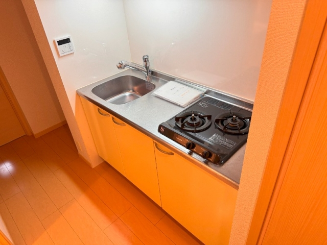 2口ガスコンロで収納もあり洗い場、調理スペースもしっかりとあります。