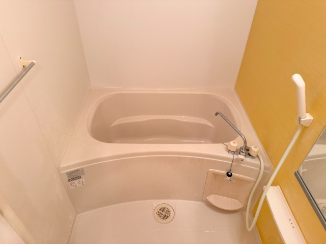 タオル掛け鏡も付いて、へきめんが黄色のかわいい浴室になっています。