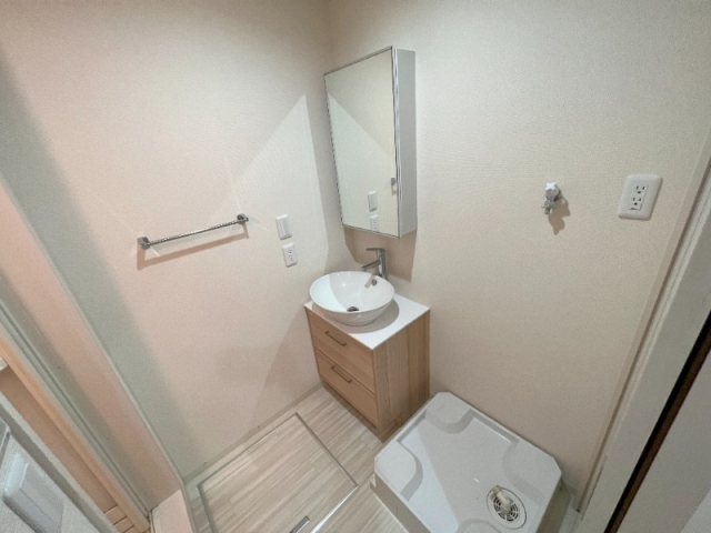 収納付き鏡と洗面台は丸くかわいいタイプになっています。