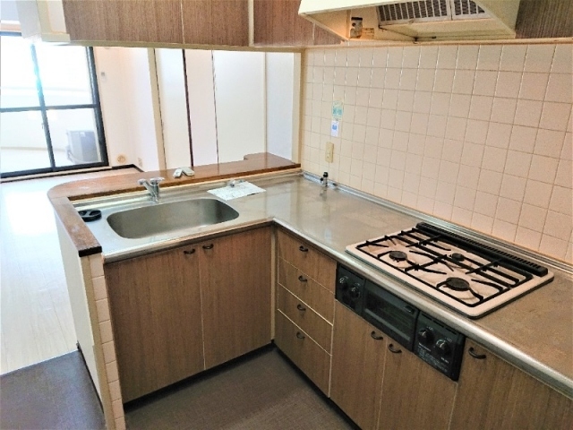 3口のガスコンロでグリルと収納も沢山ついています。