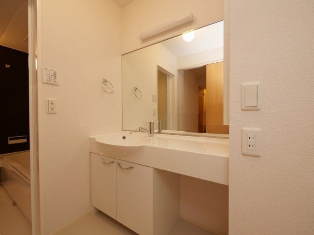 大きな鏡と収納があり、洗面台もとても大きいです。