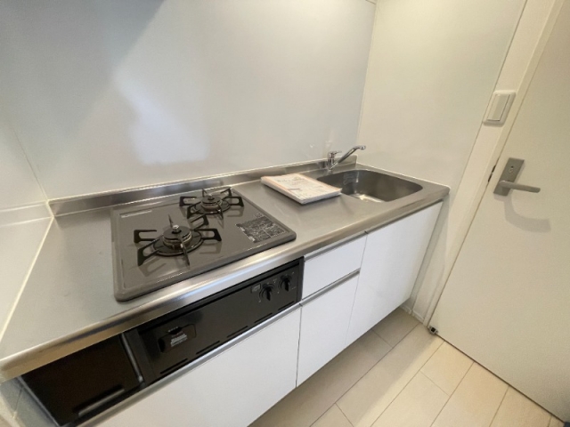 2口ガスコンロと洗い場首脳があります。