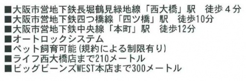 | 交通 | 大阪メトロ長堀鶴見緑地線 「西大橋」駅 徒歩 4分 大阪メトロ四つ橋線 「四ツ橋」駅 徒歩10分 大阪メトロ中央線 「本町」駅 徒歩12分 |