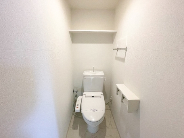 温水洗浄便座タイプのトイレで、大理石風な床がアクセントな内装。