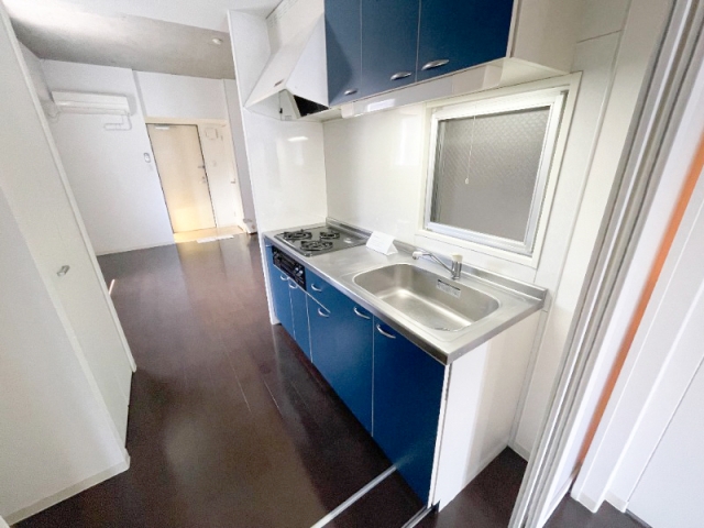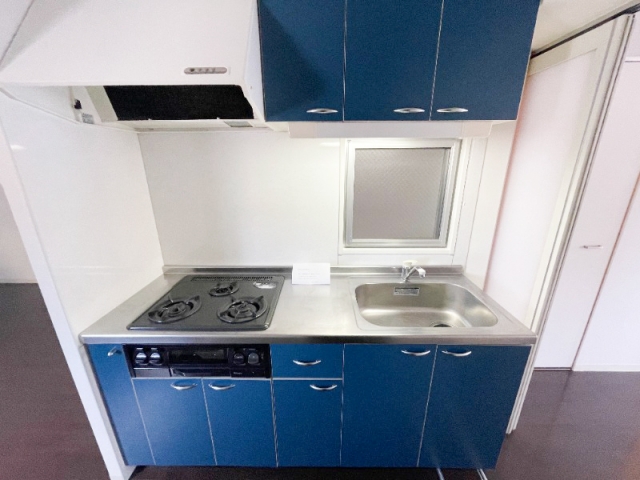 青色がお洒落なシステムキッチンです。