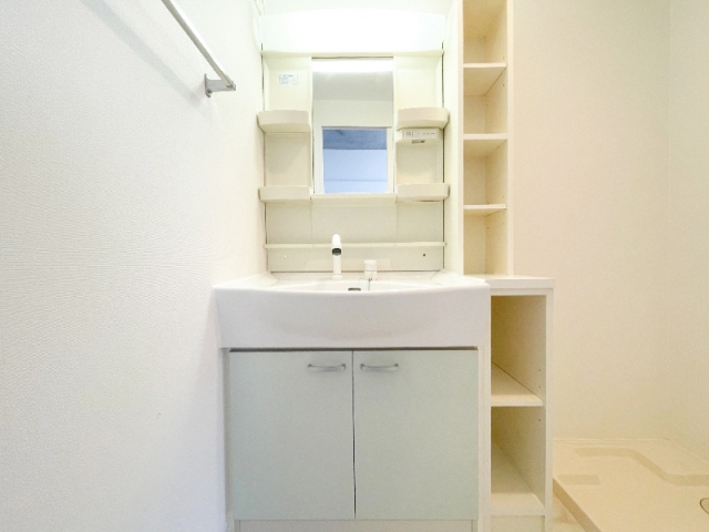 洗面台の隣には、棚があるので、