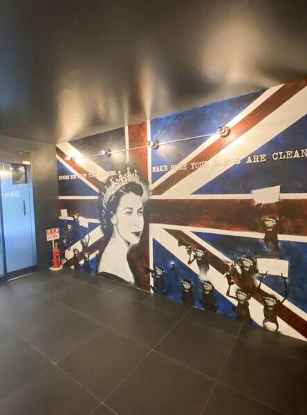 ユニオンジャックなデザイン壁の個性がひかる内装です。