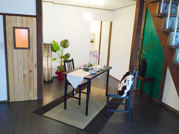 ダイニングは壁や床、天井や照明等もリノベしてキレイ。