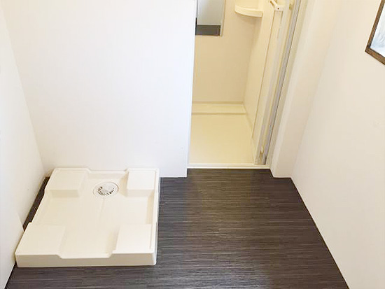 奥に見える洗面のスペースが脱衣所兼洗濯機置場。
