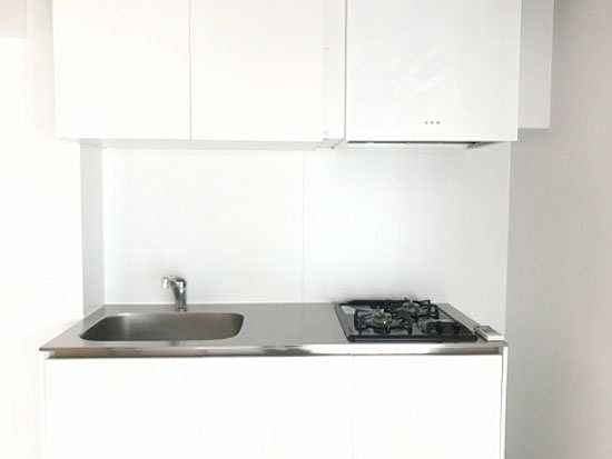 そして、水回り。2口ガスのシンプルなホワイトキッチン。