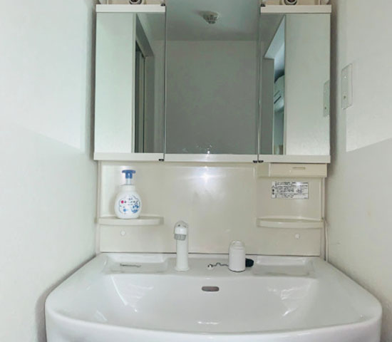 独立洗面台は収納も十分ですし、大きめの三面鏡があります。