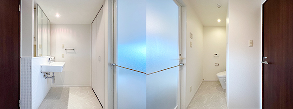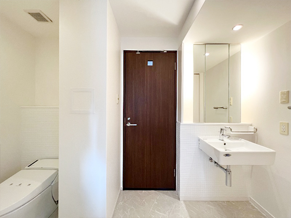 扉を挟んで、左右にトイレと洗面台がある
