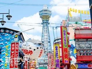 通天閣にジャンジャン横丁、大きなフグ提灯の看板などで有名な大阪市南部の下町界隈が「新世界」です。通天閣の真下にある地下の通天閣劇場では毎週月曜日、各地方で活躍する歌姫たちが演歌を熱唱し、通天閣劇場TENGEKIでは毎週土日に漫才や上方落語などで観客を楽しませています。また、串カツ屋、どて焼き屋、囲碁将棋クラブなど約50軒の店が軒を連ねる「ジャンジャン横丁」は、観光客で賑わっており、ビリケンさんやフグ提灯の看板などをバックに記念写真撮影を楽しでいます。