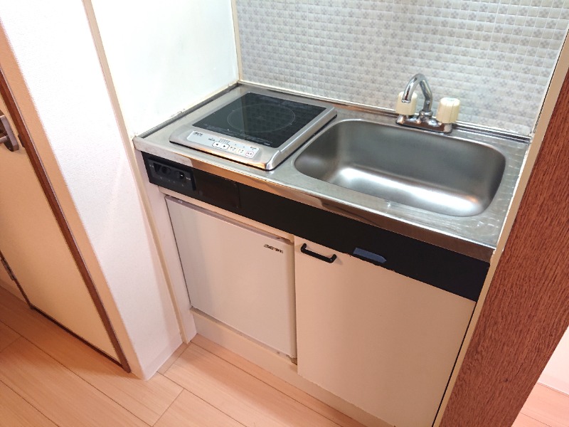 キッチンには1口のIHコンロが設置されており、ミニ冷蔵庫付きです。