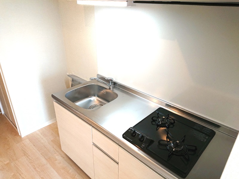 2口ガスコンロで、収納も4つついていますので洗い場、調理場もしっかりあります。
