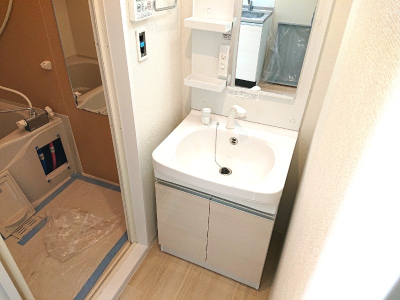 洗面台は鏡横に棚が3段ついていて、下に収納も付いています。