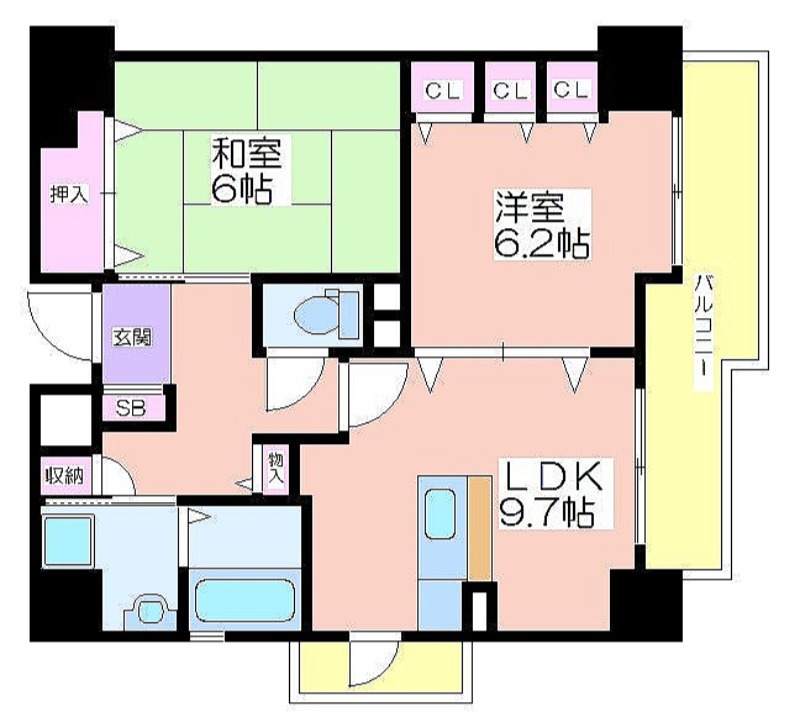 | 共益費:11,000円 | 専有面積:53.37㎡ 間取り詳細:LDK 9.7帖,洋室 6.2帖,和室 6畳 |
