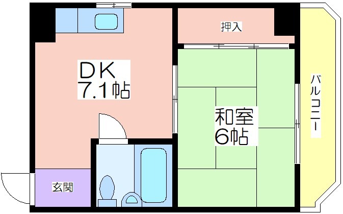 | 共益費:5,000円 | 専有面積:27.43㎡ 間取り詳細:DK 7.1帖,和室 6畳 |