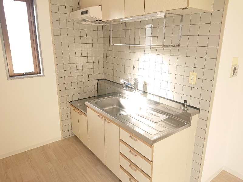 シンク、調理場、コンロスペースもしっかりとあって、下に収納も沢山ございますので、食器を用途に合わせて分けて整理することが可能なキッチンとなっています。