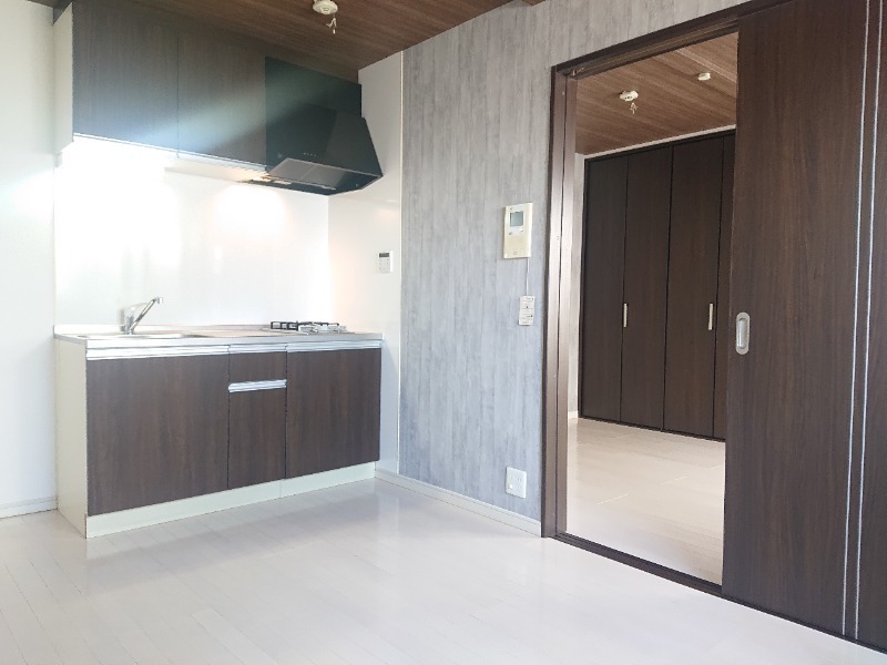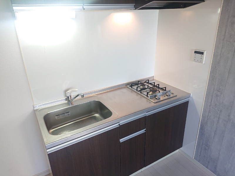 キッチンは2口ガスコンロで、上下に収納も付いていて、シンクもとても広く調理場も充分にあるキッチンとなっています。