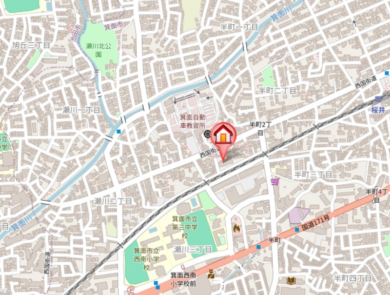 | 近隣情報 | スーパー:フレスコ桜井店228m ホームセンター:ニトリ箕面店482m コンビニ:ファミリーマート箕面瀬川二丁目店499m 小学校:箕面市立西南小学校543m ドラッグストア:コジマドラッグ箕面店756m ショッピングセンター:西松屋豊中永楽荘店1637m |