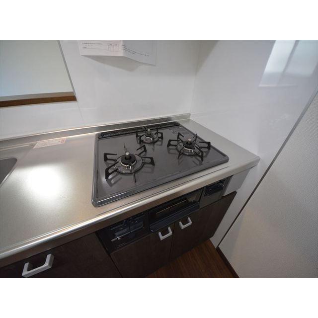 二人入居可、システムキッチン、給湯、シャワー付洗面化粧台、CSアンテナ、BSアンテナ、宅配ボックス、温水洗浄便座、浴室乾燥機、洗面所独立、クローゼット、シューズボックス、照明器具付き、保証人要、水道(公営)、ガス(都市)、排水(下水)、バス専用、バス・トイレ別、シャワー、ガスコンロ、コンロ(三口)、エアコン、室内洗濯機置き場、オートロック、バルコニー、フローリング、TVドアホン、インターネット使用料無料、敷金なし