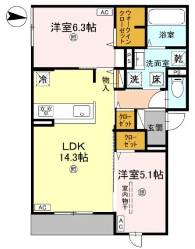 | 共益費:8,500円 | 専有面積:60.91㎡ 間取り詳細:LDK 14.3帖,洋室 6.3帖,洋室 5.1帖 |