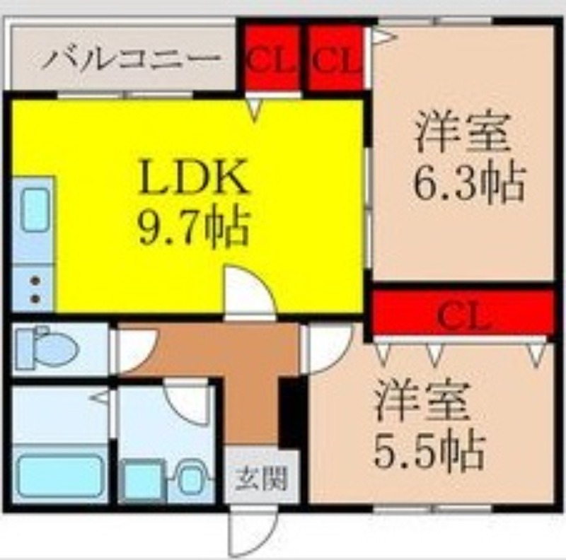 | 共益費:6,000円 | 専有面積:51.05㎡ 間取り詳細:洋室 6.3帖,洋室 5.5帖,LDK 9.7帖 |
