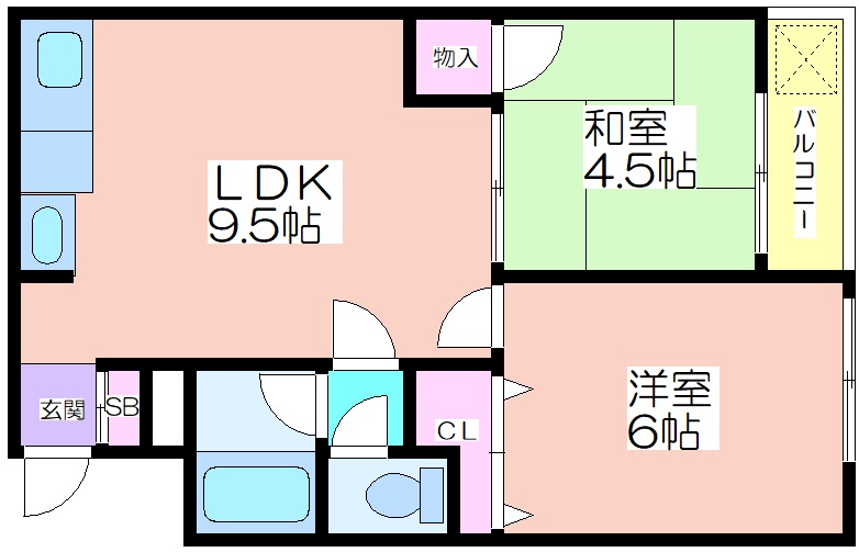 | 共益費:5,000円 | 専有面積:39㎡ 間取り詳細:DK 9.5帖,洋室 6帖,和室 4.5畳 |