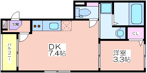 | 共益費:4,000円 | 専有面積:26.79㎡ 間取り詳細:DK 7.4帖,洋室 3.3帖 |