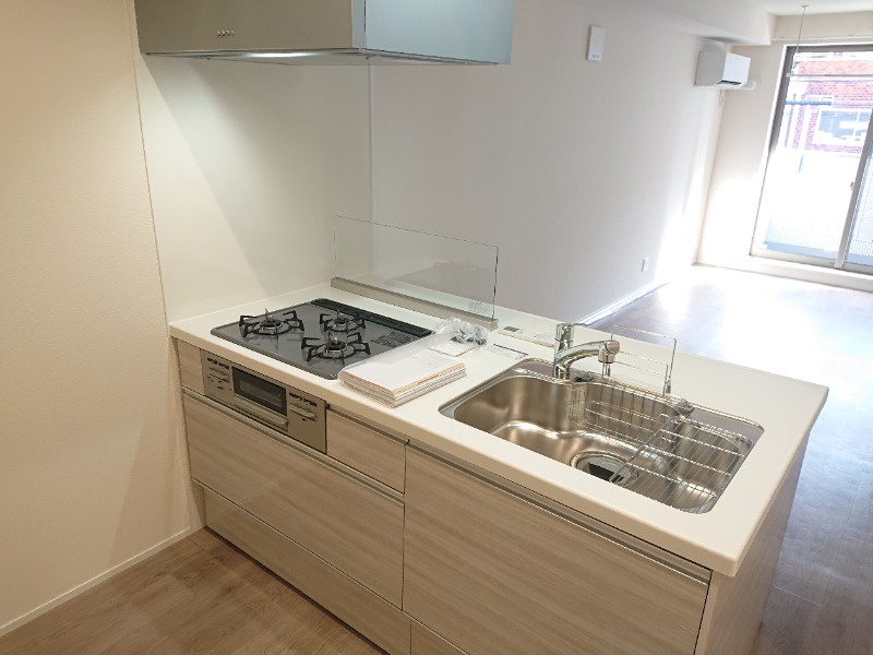 二人入居可、システムキッチン、給湯、追焚機能、宅配ボックス、駐輪場あり、温水洗浄便座、浴室乾燥機、洗面所独立、クローゼット、シューズボックス、水道(公営)、ガス(都市)、排水(下水)、バス専用、バス・トイレ別、シャワー、ガスコンロ、コンロ(三口)、エアコン、室内洗濯機置き場、オートロック、バルコニー、フローリング、インターネット対応(光ファイバー)、TVドアホン、インターネット使用料無料、敷金なし
