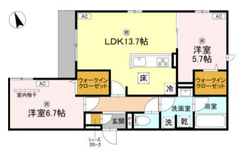 | 共益費:9,000円 | 専有面積:63.03㎡ 間取り詳細:LDK 13.7帖,洋室 6.7帖,洋室 5.7帖 |