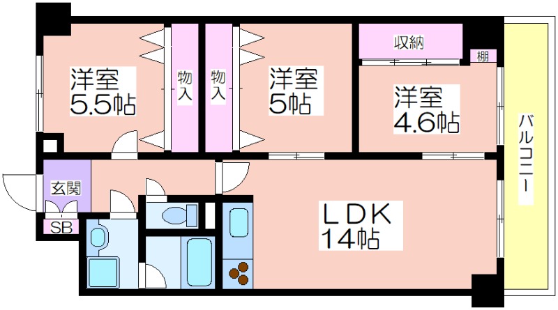 | 共益費:15,000円 | 専有面積:65.61㎡ 間取り詳細:LDK 14帖,洋室 5.5帖,洋室 5帖,洋室 4.6帖 |