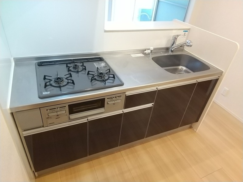 二人入居可、システムキッチン、給湯、追焚機能、シャワー付洗面化粧台、CATV、BSアンテナ、宅配ボックス、駐輪場あり、温水洗浄便座、カウンターキッチン、浴室乾燥機、洗面所独立、クローゼット、シューズボックス、保証人不要、水道(公営)、ガス(都市)、排水(下水)、バス・トイレ別、シャワー、ガスコンロ、コンロ(三口)、エアコン、室内洗濯機置き場、オートロック、バルコニー、フローリング、TVドアホン、インターネット使用料無料、セキュリティ会社