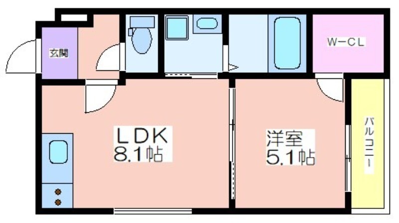 | 共益費:5,200円 | 専有面積:34.16㎡ 間取り詳細:LDK 8.1帖,洋室 5.1帖 |
