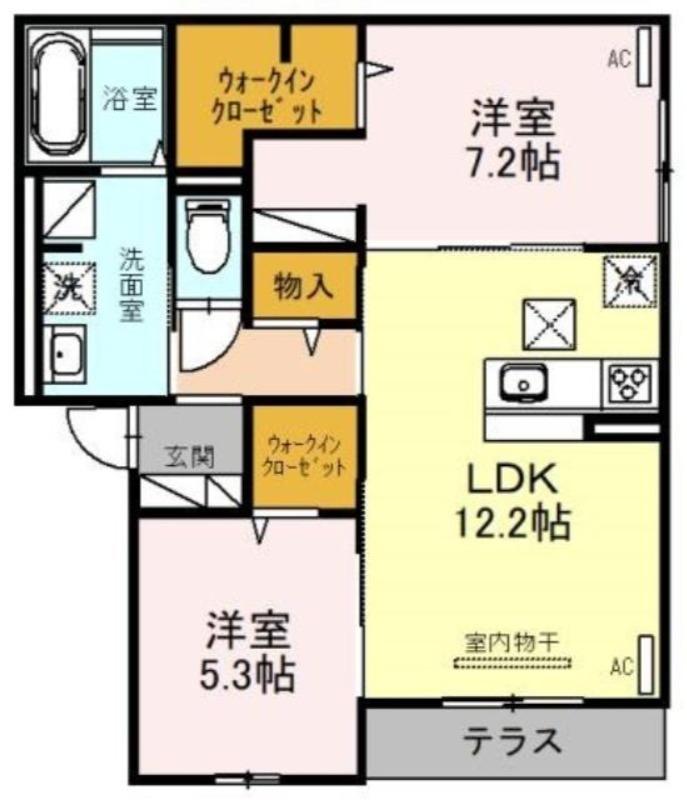| 共益費:6,500円 | 専有面積:61.74㎡ 間取り詳細:LDK 12.2帖,洋室 7.2帖,洋室 5.3帖 |