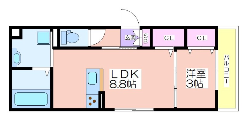 | 共益費:5,000円 | 専有面積:33.64㎡ 間取り詳細:LDK 8.8帖,洋室 3帖 |