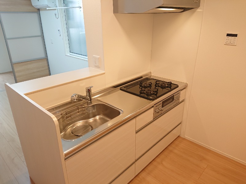二人入居可、システムキッチン、給湯、追焚機能、CATV、駐輪場あり、バイク置き場あり、角部屋、温水洗浄便座、カウンターキッチン、浴室乾燥機、洗面所独立、防犯カメラ、クローゼット、シューズボックス、水道(公営)、ガス(都市)、排水(下水)、バス専用、バス・トイレ別、シャワー、ガスコンロ、コンロ(三口)、エアコン、室内洗濯機置き場、オートロック、バルコニー、フローリング、インターネット対応(光ファイバー)、TVドアホン、インターネット使用料無料、セキュリティ会社、敷金なし