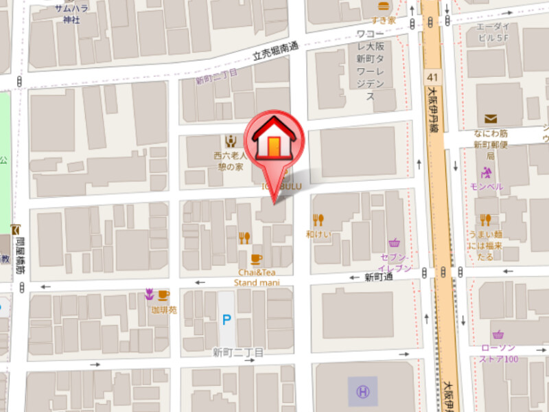 | 近隣情報 | コンビニ:セブン-イレブン 大阪新町2丁目店119m スーパー:ライフ西大橋店204m 病院:慶生会クリニック大阪245m 郵便局:なにわ筋新町郵便局256m 銀行:りそな銀行 ATM なにわ筋出張所340m ドラッグストア:スギドラッグ 南堀江店862m |